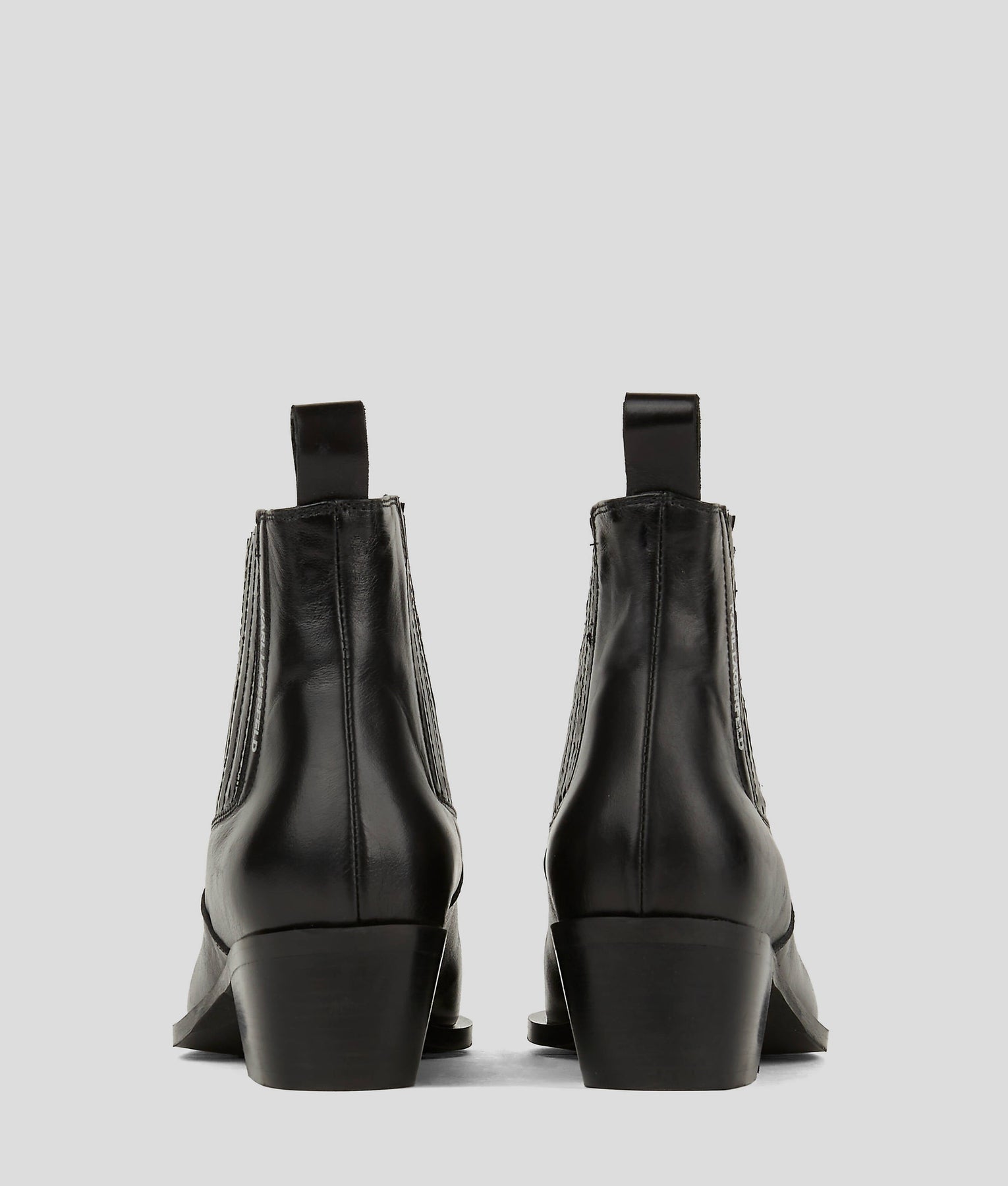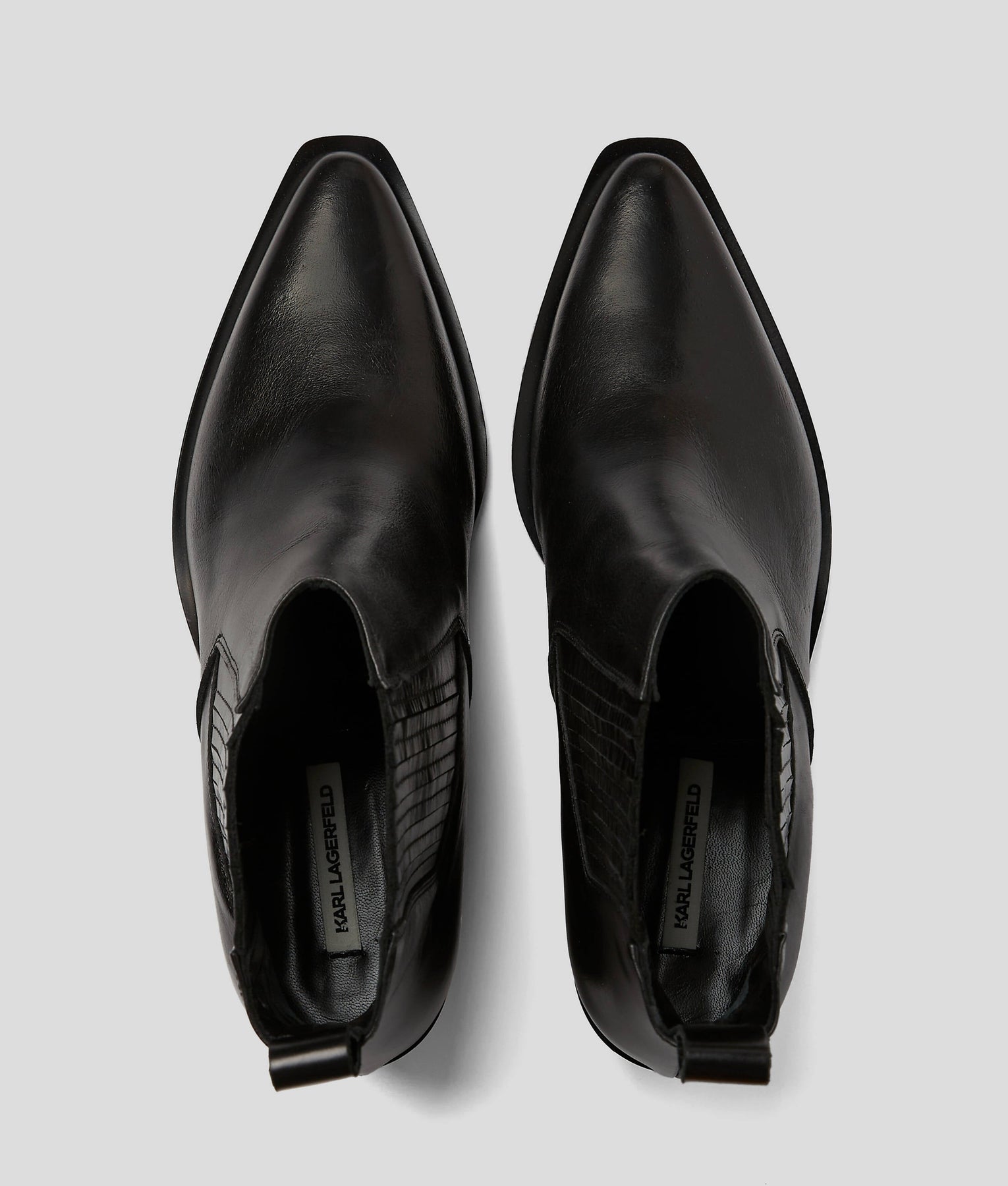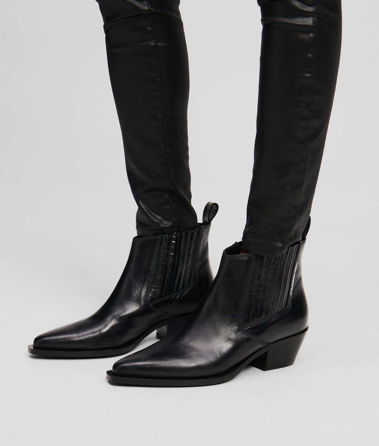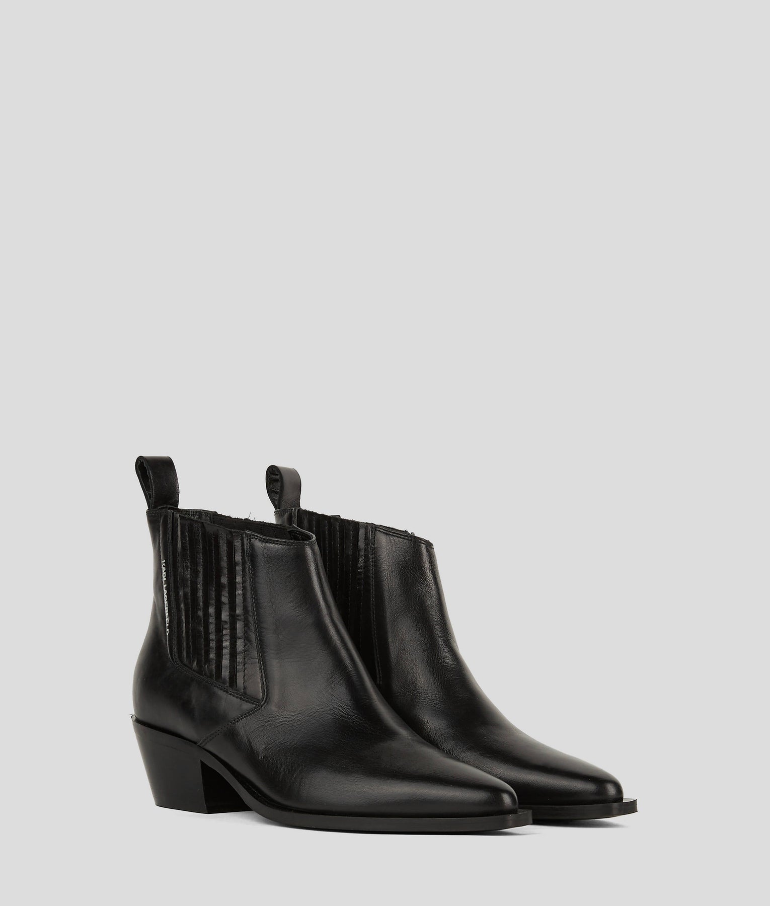 Step into understated sophistication with these leather boots from KARL LAGERFELD, complete with pointed toe and minimalist logo detailing.