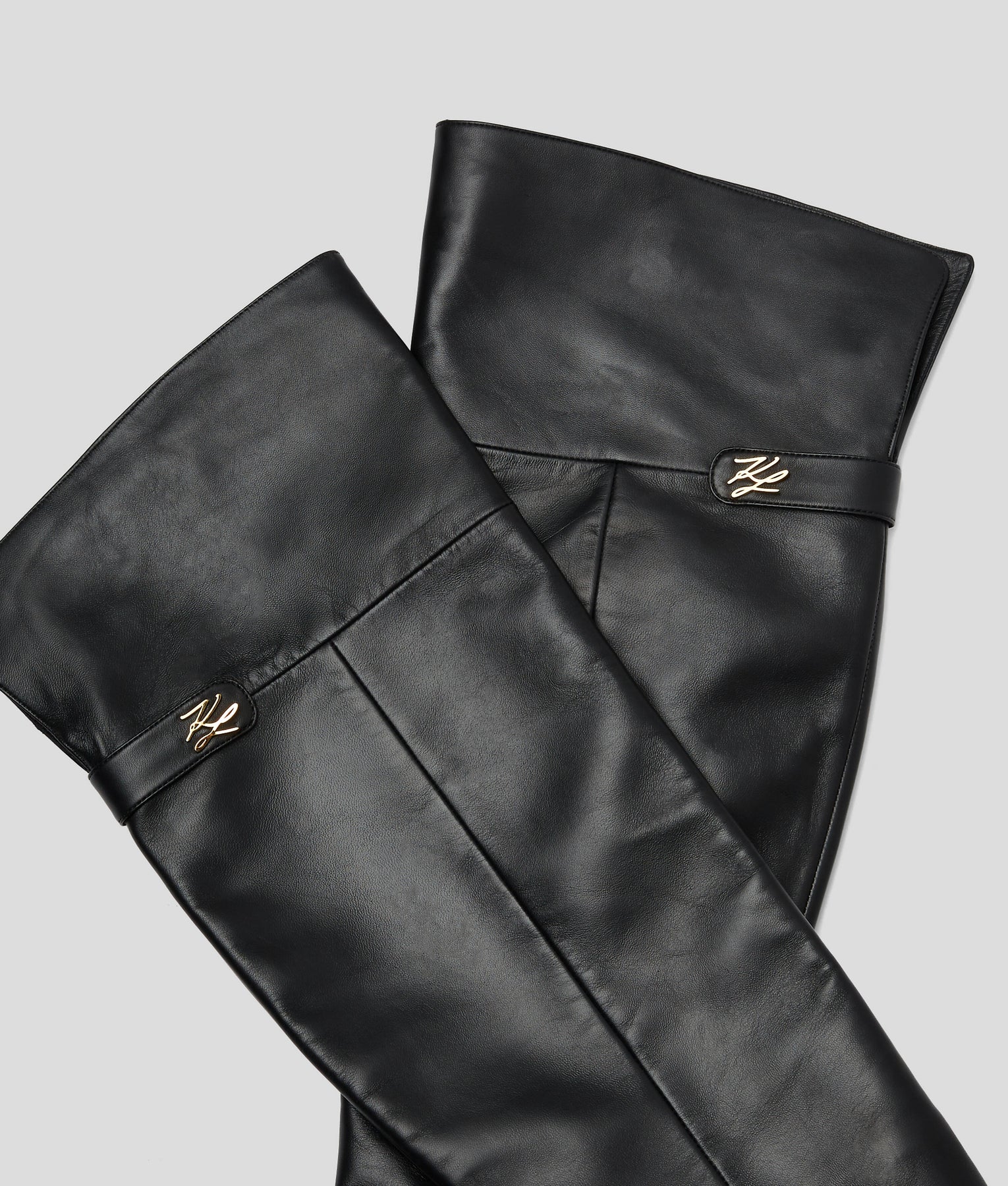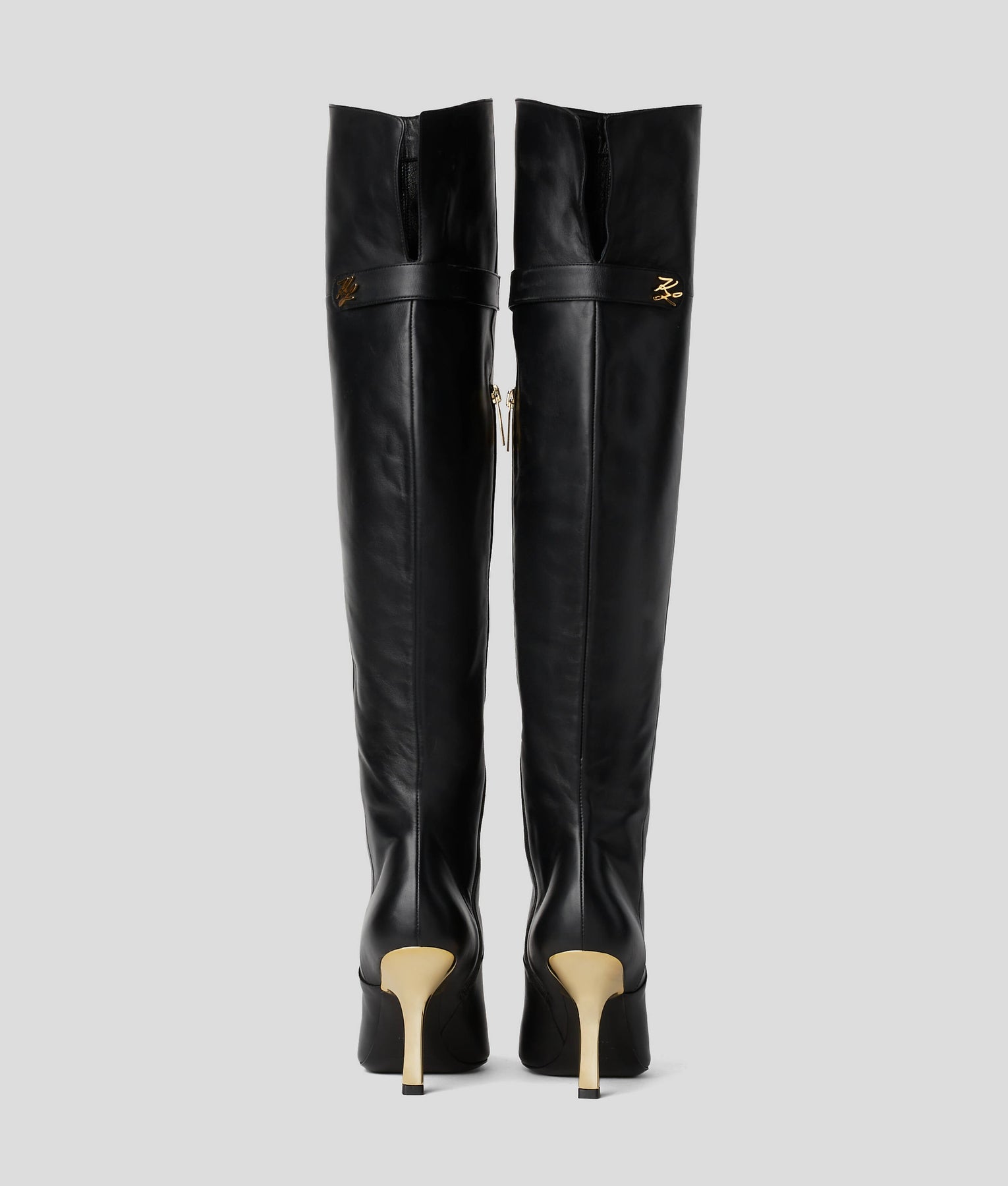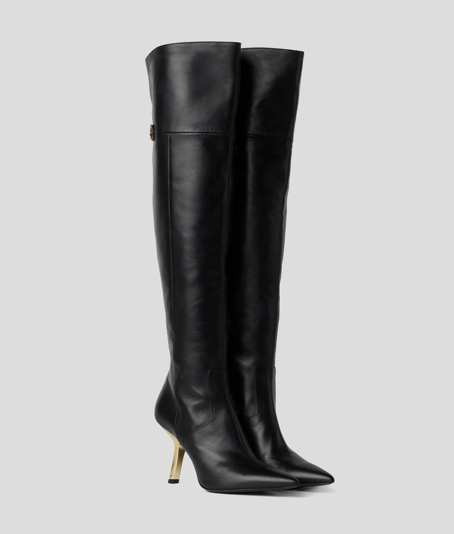 These over-the-knee boots are an empowering fashion statement. Beautifully crafted from premium leather, these boots feature a sharp pointed toe and a striking geometric metallic heel. Whether styled with sleek dresses or formal tailoring, these boots complete any look with strength and sophistication.