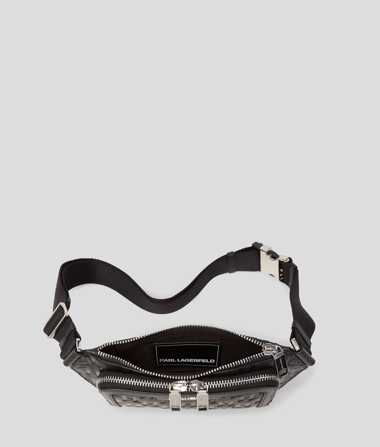 The adjustable strap with metal buckle closure on this sleek KARL LAGERFELD bum bag ensures a perfect fit, while an all-over embossed KL monogram design adds a touch of sophistication. The two-way zip closure and front pocket cater to easy access and organization.