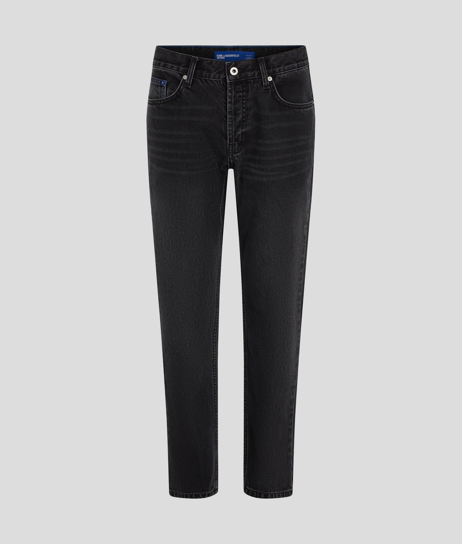 Navigate casual-cool styling with ease in these tapered washed jeans, with a branded button closure. These confident pants are anchored by KARL LAGERFELD JEANS' signature leather patch and a distinct K-embroidery accent on the back pocket.
