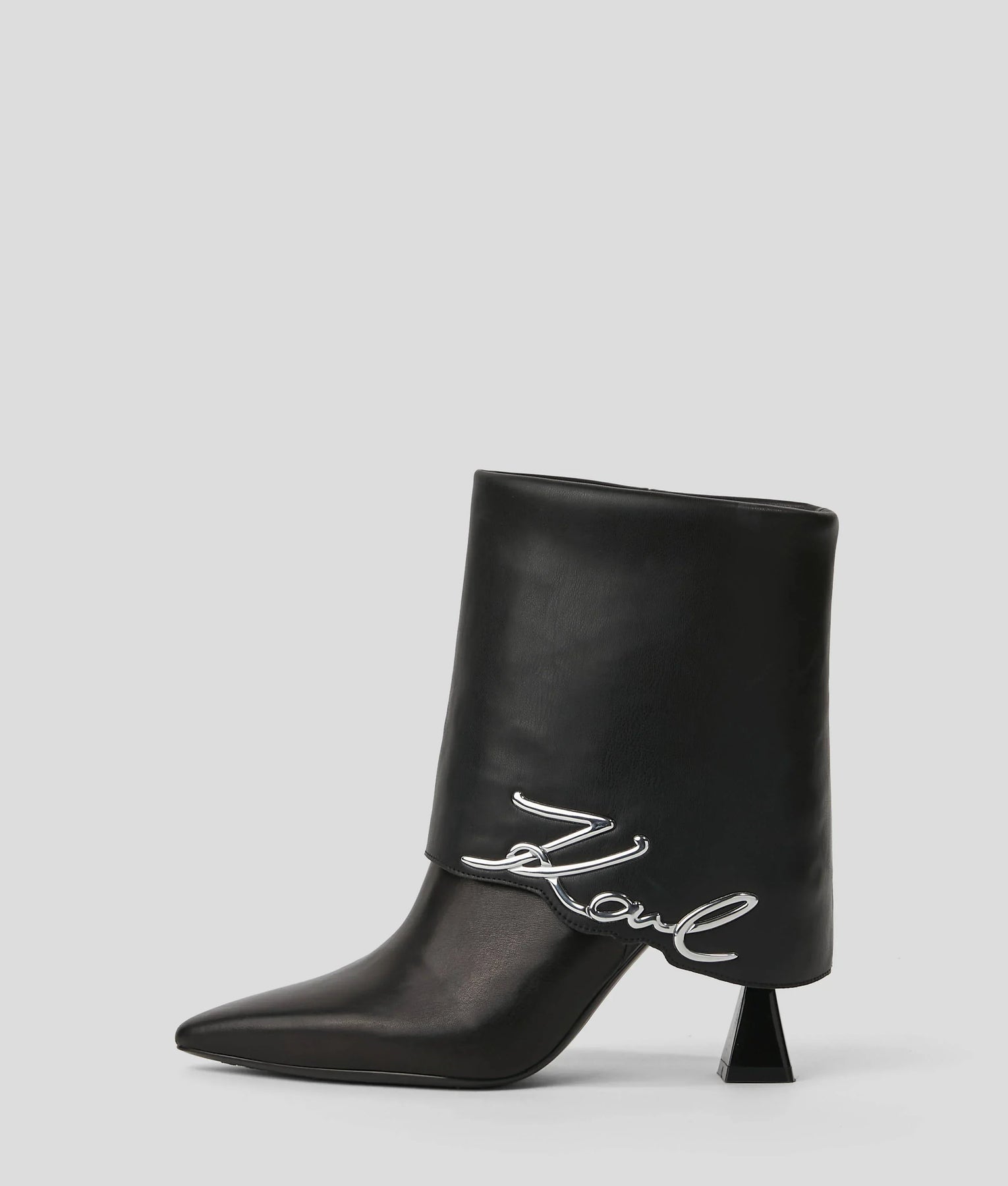 A sophisticated silhouette defines these boots, featuring a sleek pointed toe and a contemporary flared heel with a polished finish. The slip-on design ensures effortless wear, while the fold-down detail showcases the iconic Karl Signature logo, adding a touch of flair.
